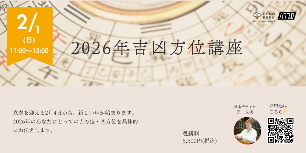 この講座では、2026年のあなたにとっての「吉方位・凶方位」を具体的にお伝えし、暮らしや住まいの選択にどう活かせばよいのかを、わかりやすく解説します。「吉方位だけを追いかける」のではなく、無理をしない・振り回されない方位の考え方も大切にお伝えするのが、この講座の特徴です。
