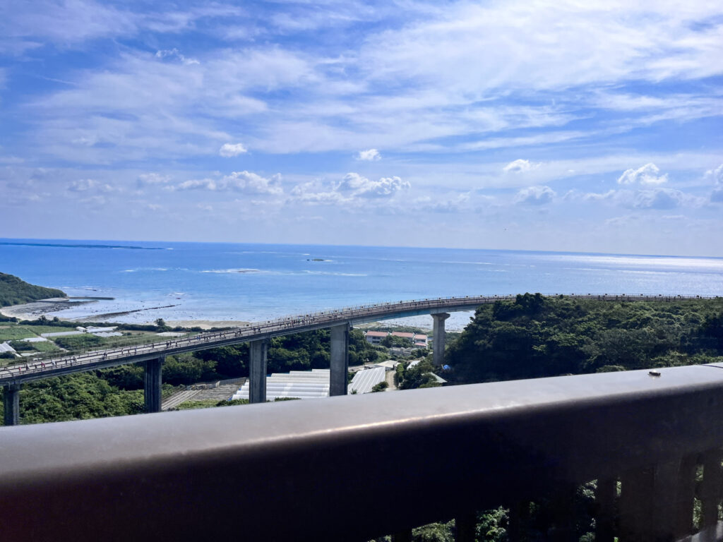 そのまま少し進むと、いよいよニライカナイ橋。これがこの大会の一番の楽しみ!ここからの景色が毎年のご褒美。車でしか通らないだろうなっていうkの場所を自分の足で走ってる!って思うと、疲れが一瞬ふっとぶのが毎回の楽しみ!ここを越えると、私の“関所”──知念小学校です!