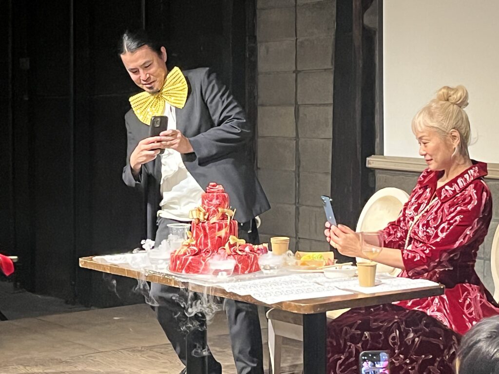 会場に到着するや、久しぶりに会う九州の友人らが多数集まっていて、温かく僕らを迎えてくれました(^_^) それに、全国から錚々たる顔ぶれのリノベーション関係者がお祝いに駆け付けていて、遠方だと(僕らもですが…)秋田から来られた方もいましたし、参加された人数の多さにびっくりしました。また、ウエディングケーキはなんと馬刺しで作られたケーキで、入刀後はしゃぶしゃぶで会場に振舞われていました。(富子さんのドレスと丸被り(笑))やっぱり熊本は馬刺しなんですね(^^♪