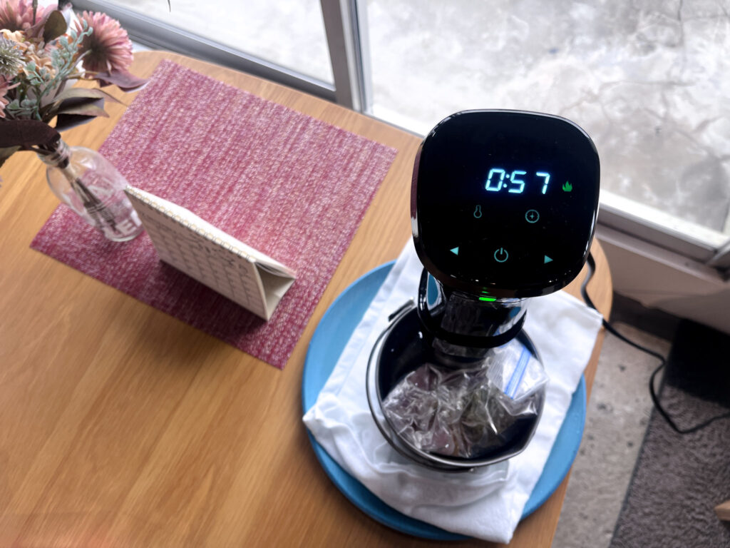 「これはもう、買うしかないな」と、レシピもよく分からないまま、先に道具を買うことにしました(だいたいいつもこの流れ、道具から入るタイプです、しかもよくよく考えたら、低温調理”器”とは言っていない!)。長男が仲間から情報収集してくれて低温調理器を早速購入。付属のレシピブックを見ながら調理…といっても、やったのは材料を袋に入れて温度と時間をセットするだけ。後は放置!こんなに簡単なのにしっとりしたサラダチキンっぽいものが完成。冷蔵庫で冷やしても、しっとり感はそのまま!コンビニのサラダチキンみたいな独特の味や中のパサつきがまったくない!お〜!低温調理器、使えるぞ!