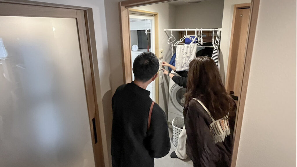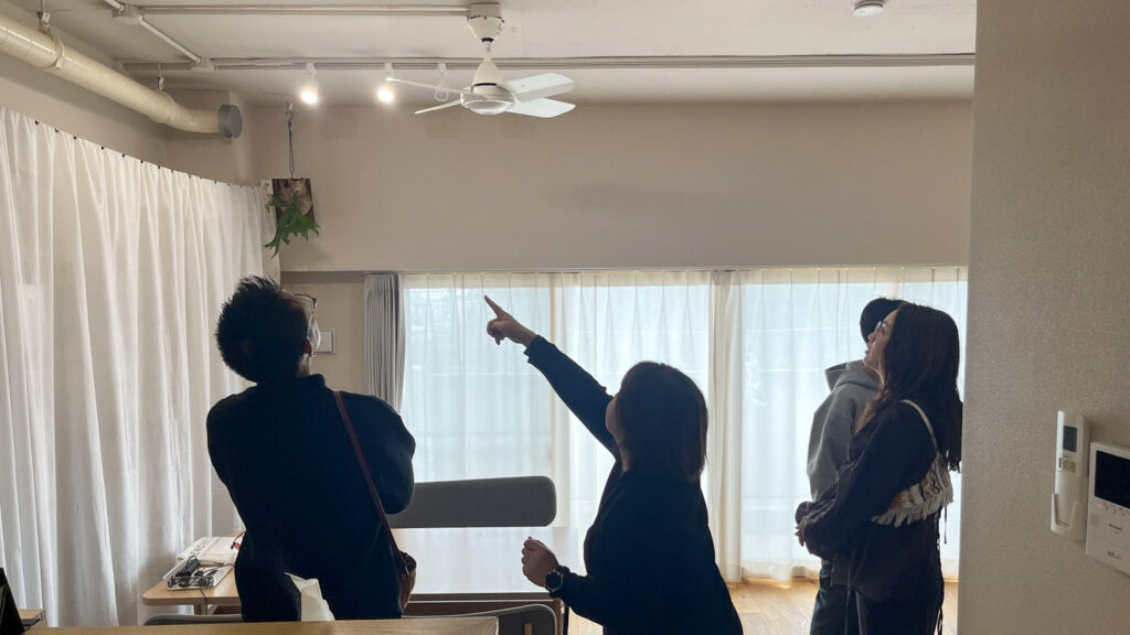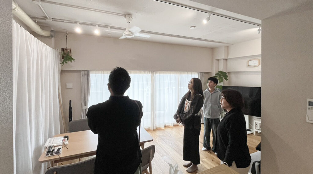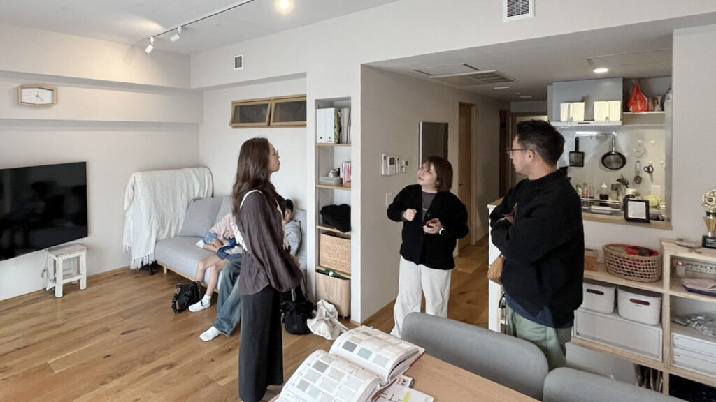 開催できたもうひとつの理由が、私がRENOBEESモデルルームだったマンションを購入したこと。引っ越しをしてから1年ちょっと。すこしずつ落ち着いてきた頃で、実際に生活してみて初めて分かることも多く、家具や建具の高さや空間の奥行き、色の見え方、収納のクセなど、図面では伝えきれない部分もお伝えできるんじゃないかと思ったんです。完成した瞬間のきれいなモデルルームではなくて「ここは住んでみて変えた」「これは思ったより使わなかった」「これは想像以上によかった」そういう「住んでからのリアル」を感じられるような、あえて住んでいる家を見てもらう見学会がしたかった。実際、何もないスッキリしたモデルルームより、生活感があるほうが、自分の暮らしに置き換えやすいとずっと思っていました。