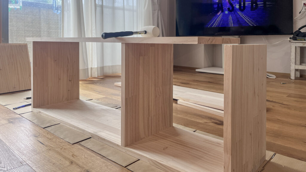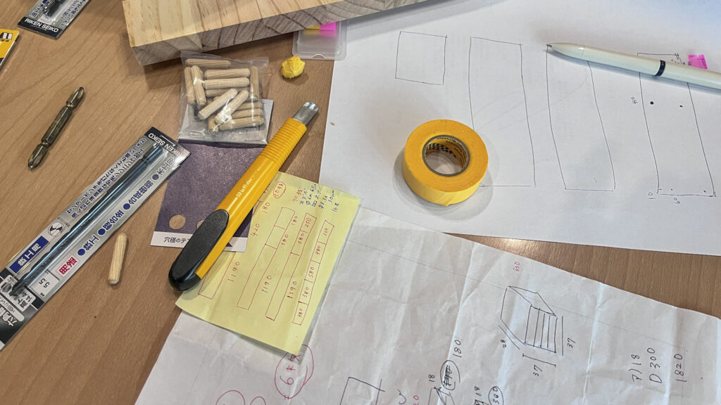 ということで、急きょDIYすることにしました。ネットで調べて、サイズを測って。必要なものがなかったり、足りなかったりでホームセンターに何度も通ったりと試行錯誤。どうしても見学会までに棚がほしかった理由は、「収納のサイズ感も体感できる見学会」にしたかったからです。結果、3日かけてなんとか完成。正直、めちゃくちゃ大変でした。とくにダボ綱木。穴を合わせるのが難しすぎる!!家具職人さん、本当にすごいなとリスペクト!既製品の組み立て家具って、本当によく考えられて作られているんだなと、身をもって実感!いい経験になりました。