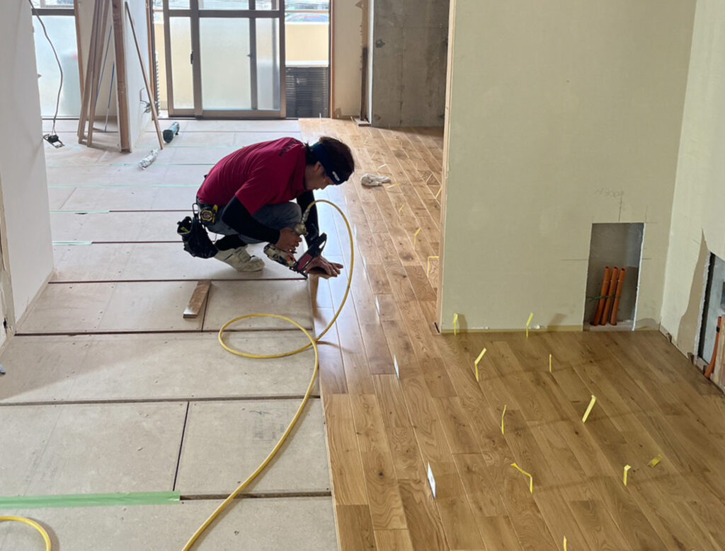 一方でマンションリノベは2戸とも、床のフローリング施工と壁を立てる大工工事が進んでいます。