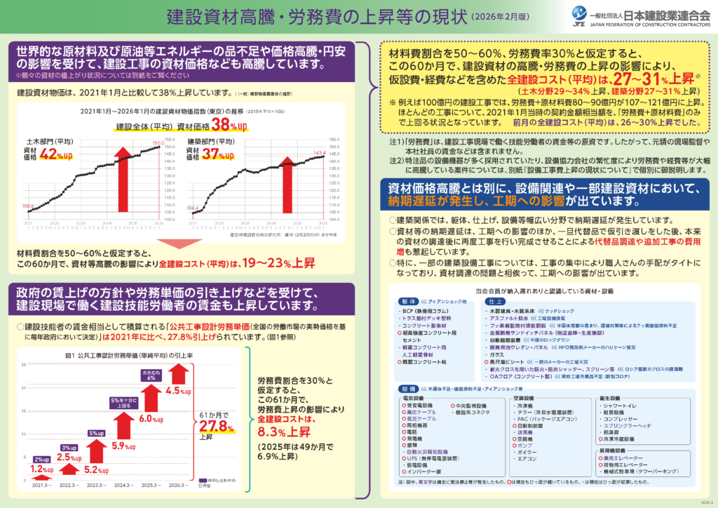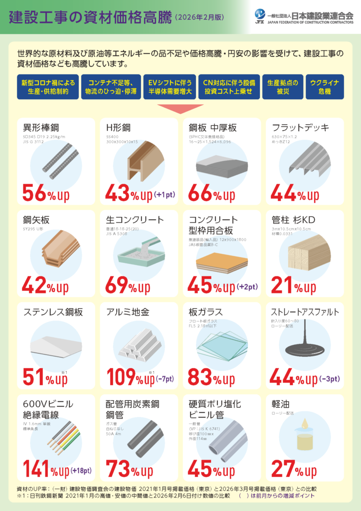 実は建設業は、もともと他の業種に比べて「賃金が低い」「労働時間が長い」という課題がありました。その影響もあって、人が減っているというより、現場の職人さんたちの年齢は上がり、新しくこの仕事を選ぶ人自体も減ってきているというのが今の現場の状況。そのため、いま感じている「高くなったな」という感覚は、単純な値上げというよりも、「職人さんの働き方を整える」「適正な賃金を支払う」「業界を持続可能にする」というような是正に近い動き。また、電線や床材などの仕上げ資材など一部の材料は「納期の遅れ」も発生していて、「価格が上がる」と「納期が読みにくい」という2つが同時に起きている状況です。