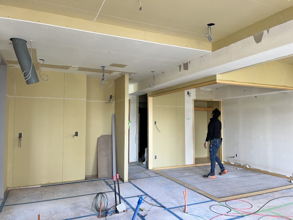 今のこうした状況の中でも、RENOBEESのリノベ現場は今日も動いています。マンションリノベの現場は、現在2戸とも仕上げの工程に入り、壁紙を貼っていく段階です。ここまでくると、一気に部屋としてのイメージが見えてきて、図面で見ていたときとは印象がガラッと変わります。ここでの暮らしがイメージできてくるタイミング。完成までもう少し。現場に行くたびに少しずつ変わっていくのが、今はとても楽しみです。