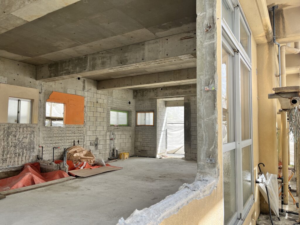 リノベーションは、「図面通りに作る工事」ではなく、「状況を見ながら最適解を探していく工事」です。特に沖縄のコンクリート住宅は、解体して初めて分かることも少なくありません。とはいえ、何でもかんでも途中で決める、というわけではなくて、工事がスムーズに進むように仕様や材料は着工前にしっかり決めていきます。できるだけ変更が出ないように進めながら、それでも現場で見えてくることについては、その都度、一緒に判断していく。この進め方が、結果として一番納得のいくリノベーションにつながると考えています。